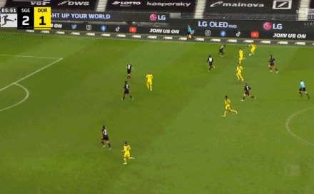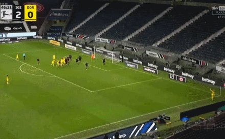 15'科斯蒂奇开出任意球,博雷抢点射门被扑,打在门柱上弹进球门,法兰克福1-0多特蒙德!
